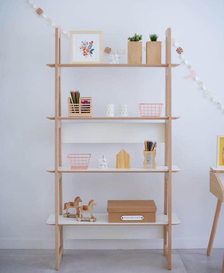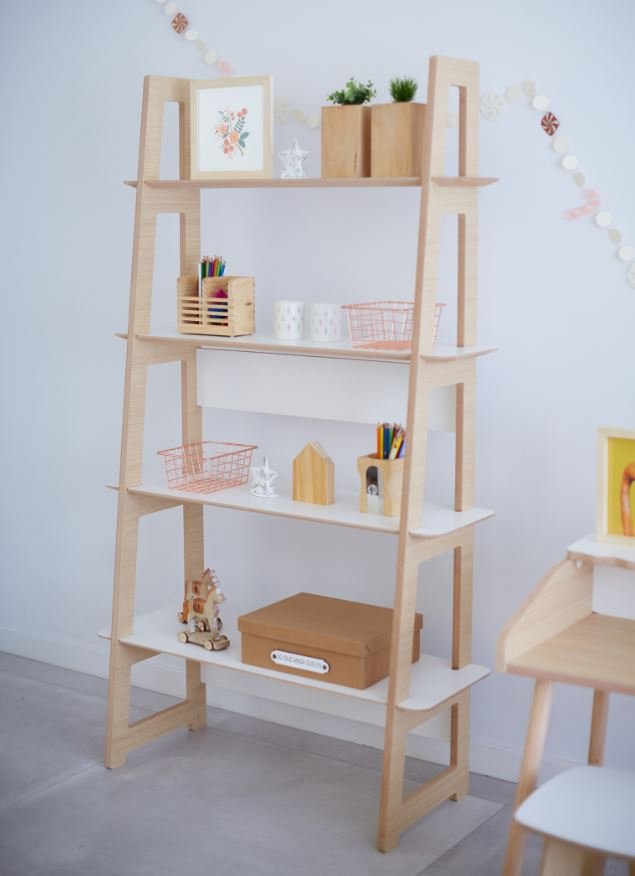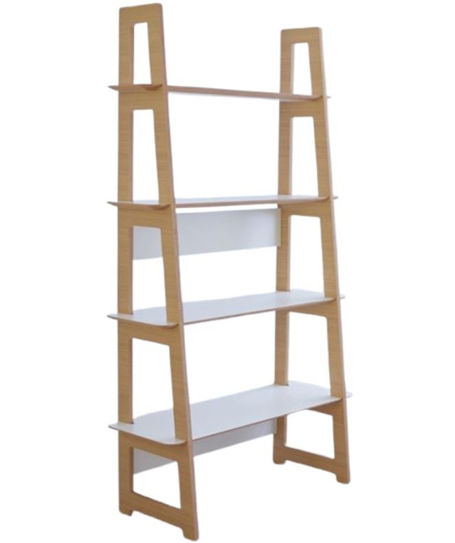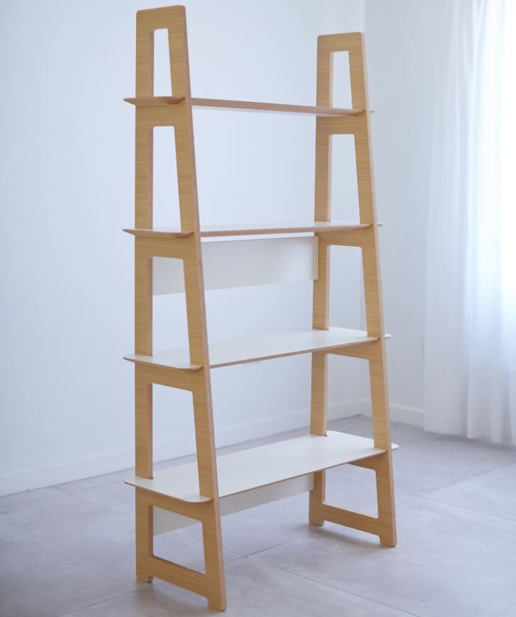Biblioteca construida en Melamina blanco y roble de 18 mm de espesor, el Armado es principalmente por encastre y luego requiere de destornillador.